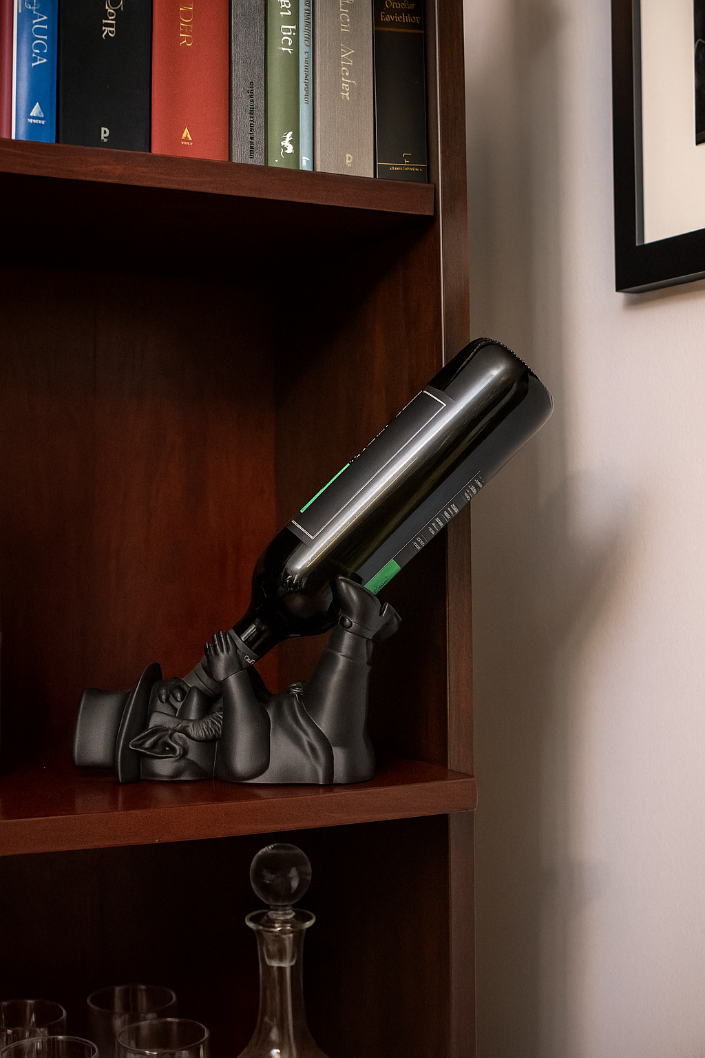 Adaugă un strop de magie și umor colțului tău de relaxare cu Suportul de Sticlă de Vin Spiriduș. Creat din PLA durabil prin imprimare 3D, acest suport redă un spiriduș simpatic prins într-o poziție amuzantă, ținând cu entuziasm sticla ta preferată. Ideal pentru barul din sufragerie sau ca piesă centrală în bibliotecă, acest accesoriu îmbină funcționalitatea cu un design jucăuș și atrăgător. Fie că ești gazda unei cine sau cauți un cadou original, spiridușul este gata să-ți țină vinul la îndemână, cu stil și personalitate.